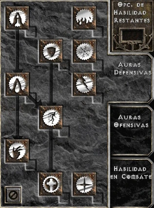 | Auras Defensivas — Plegaria • Resistencia al Fuego • Desafío • Resistencia al Frío • Purificación • Resistencia a los Rayos • Vigor • Meditación • Redención • Salvación Auras Ofensivas — Fuerza • Fuego Sagrado • Espinas • Objetivo Bendecido • Concentración • Ola de Frío Sagrada • Golpe Sagrado • Santurio • Fanatismo • Convicción Habilidad en Combate — Sacrificio • Golpe • Rayo sagrado • Ahínco • Embestida • Venganza • Martillo Bendito • Conversión • Escudo Sagrado • Puño de los Cielos |