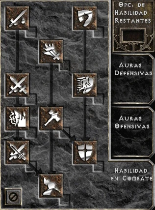 | Auras Defensivas — Plegaria • Resistencia al Fuego • Desafío • Resistencia al Frío • Purificación • Resistencia a los Rayos • Vigor • Meditación • Redención • Salvación Auras Ofensivas — Fuerza • Fuego Sagrado • Espinas • Objetivo Bendecido • Concentración • Ola de Frío Sagrada • Golpe Sagrado • Santurio • Fanatismo • Convicción Habilidad en Combate — Sacrificio • Golpe • Rayo sagrado • Ahínco • Embestida • Venganza • Martillo Bendito • Conversión • Escudo Sagrado • Puño de los Cielos |