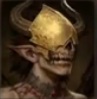 Aeshama has the basic features of a succubus (horns, pointed ears, wings, tails, clawed hands and hoofed feet). The upper part of her face is covered by a golden helm. What remains visible is emaciated and skeletal, lacking both outer nose and lips.