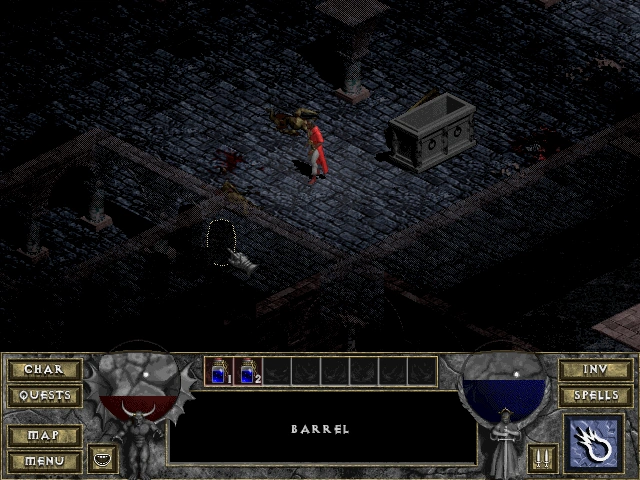 Barrels can only be broken by touching them, and when smashed open, many barrels explode, dealing random damage to the character (but not monsters nearby). Skeletons also sometimes spawn from broken barrels. Barrels can easily kill an unwary hero, so healing before opening them is advised.