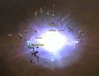 - Flurry: damage type changes to Holy, and also sweeps the impact location with swords for 5 seconds. Enemies within the area suffer 230% damage as Holy per second. Lesser enemies (non-elites) are also forcibly moved around (essentially knocked back within the area every 0.5 seconds), effectively being paralyzed. Elite enemies are highly resistant to this effect, but have a chance to be affected as well. This effect does trigger Hammer Jammers.