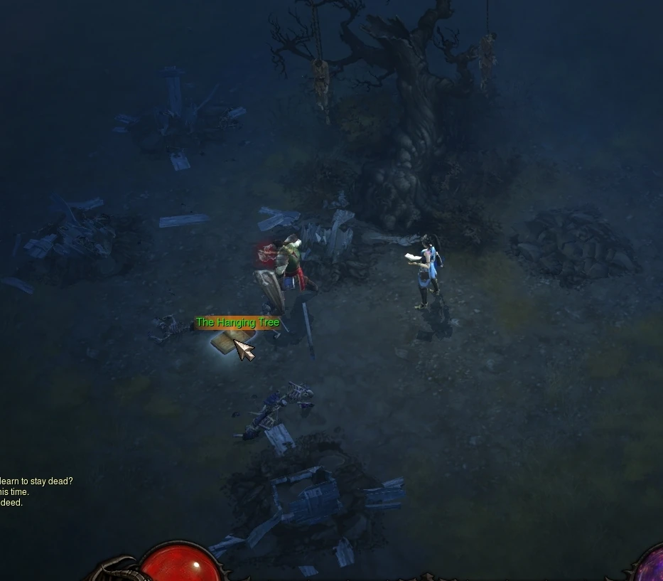 The Hanging Tree is a tome in Act I of Diablo III. It can be found in The Weeping Hollow just past the New Tristram entrance. The book drops from a skeleton that spawns underneath a tree with three bodies hanging from it and one or more coffins underneath the bodies.