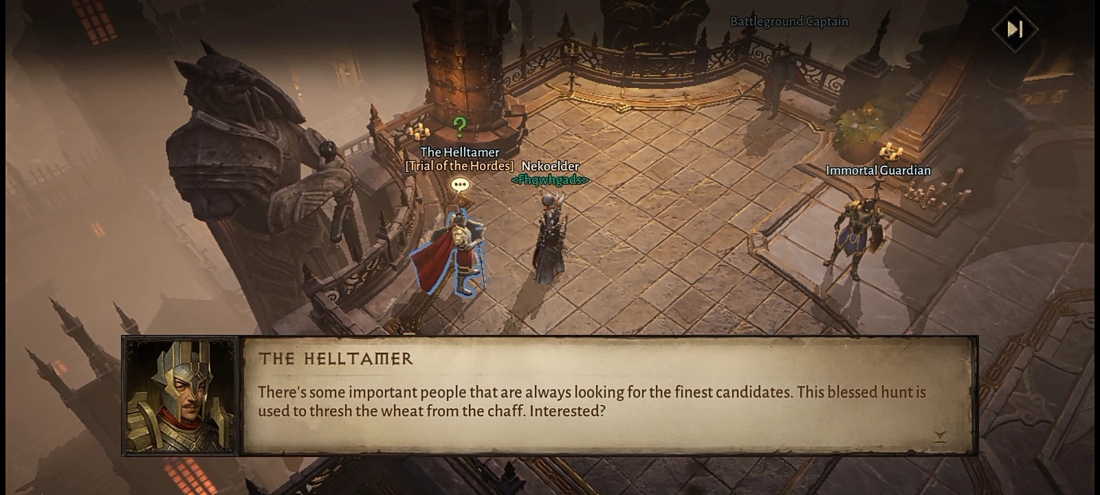 - Helltamer: There's some important people that are always looking for the finest candidates. This blessed hunt is used to thresh the wheat from the chaff. Interested?