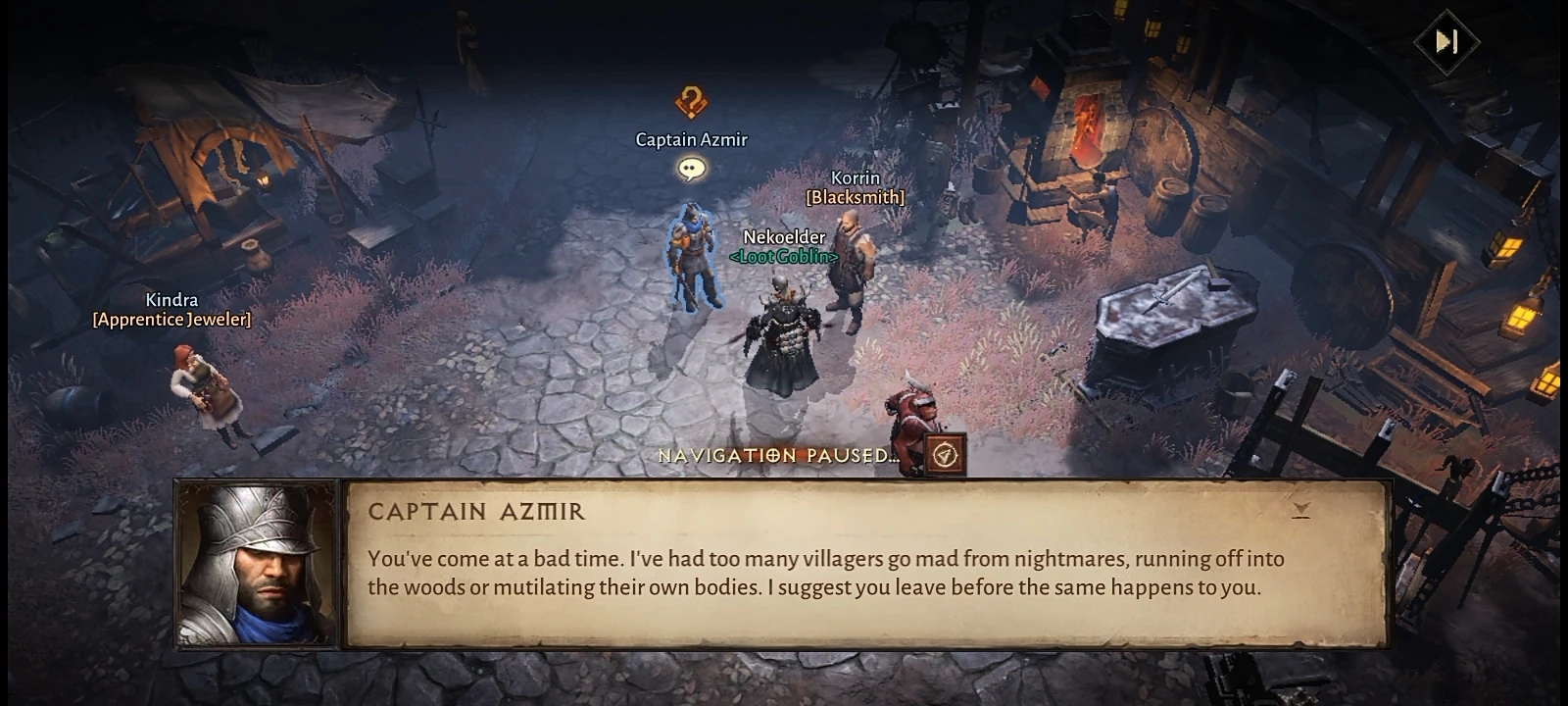 - Captain Azmir: You've come at a bad time. I've had too many villagers go mad from nightmares, running off into the woods and mutilating their own bodies. I suggest you leave before the same happens to you.